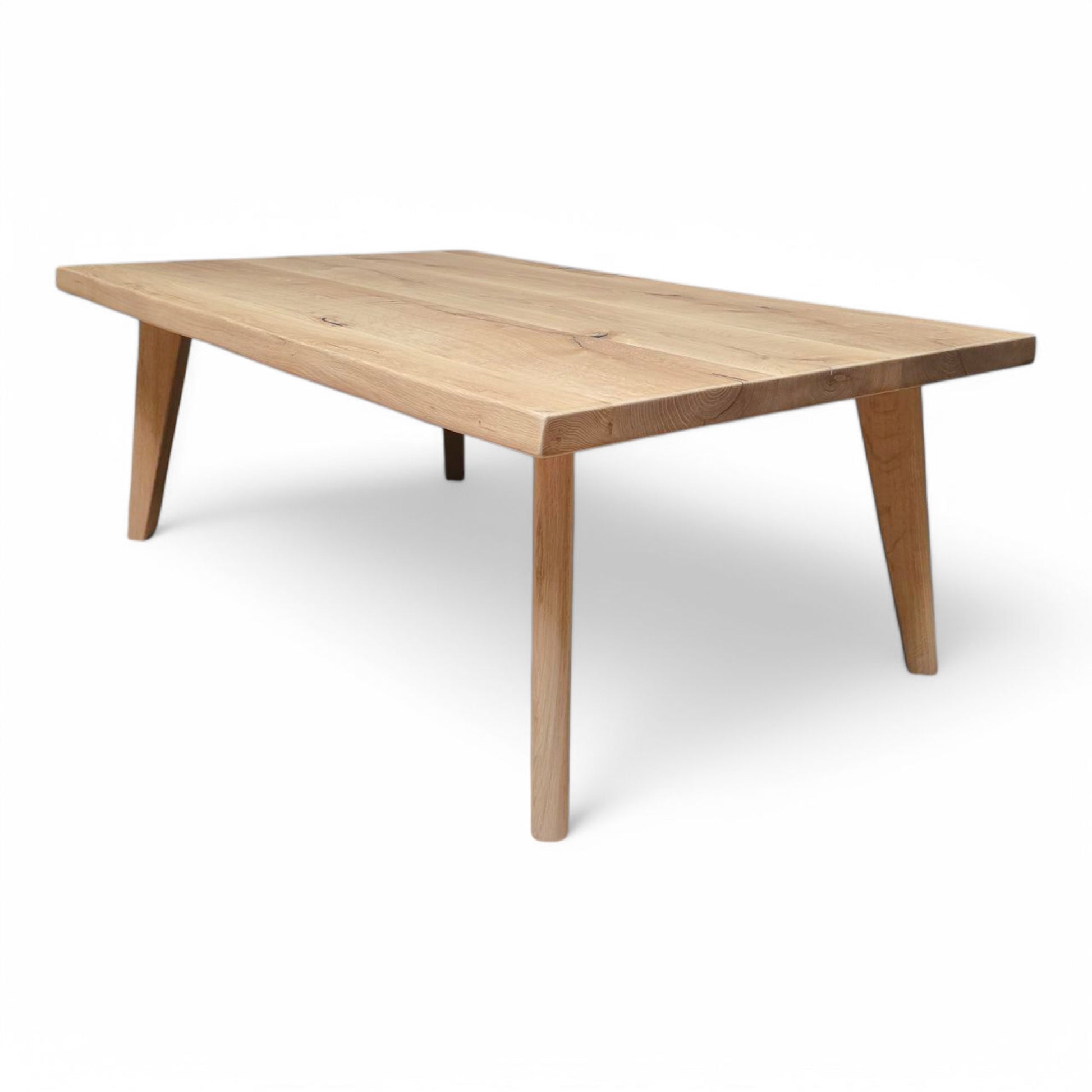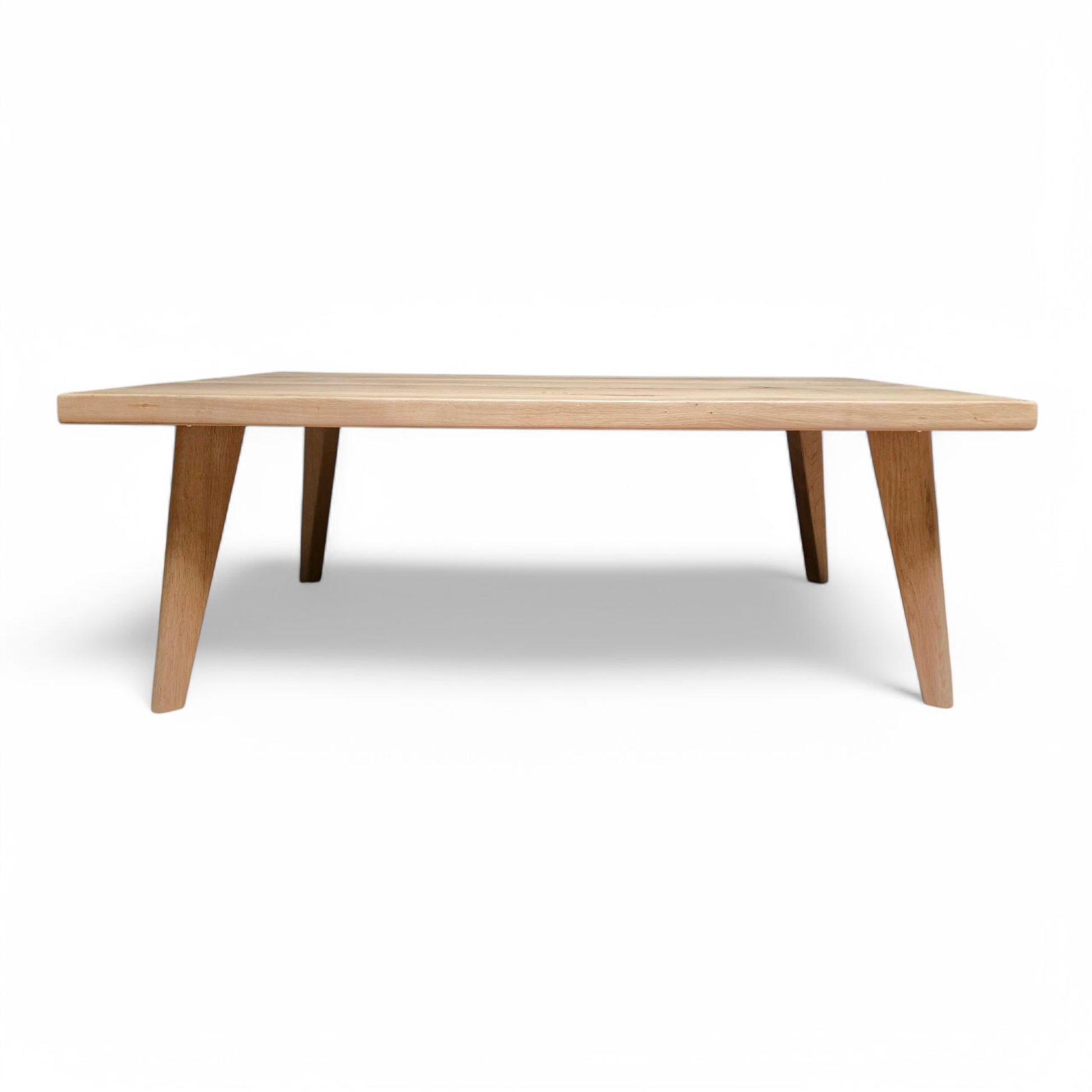 Die vollmassive Couchtischplatte (4 cm) liegt auf vier schräg ausgestellten Beinen aus massiver Eiche, die dem Tisch eine moderne Leichtigkeit im skandinavischen Design verleihen. Entlastungsfugen und Stahlverstärkungen auf der Unterseite sorgen für dauerhafte Stabilität – dein Tisch bleibt in Form, auch nach vielen Jahren.